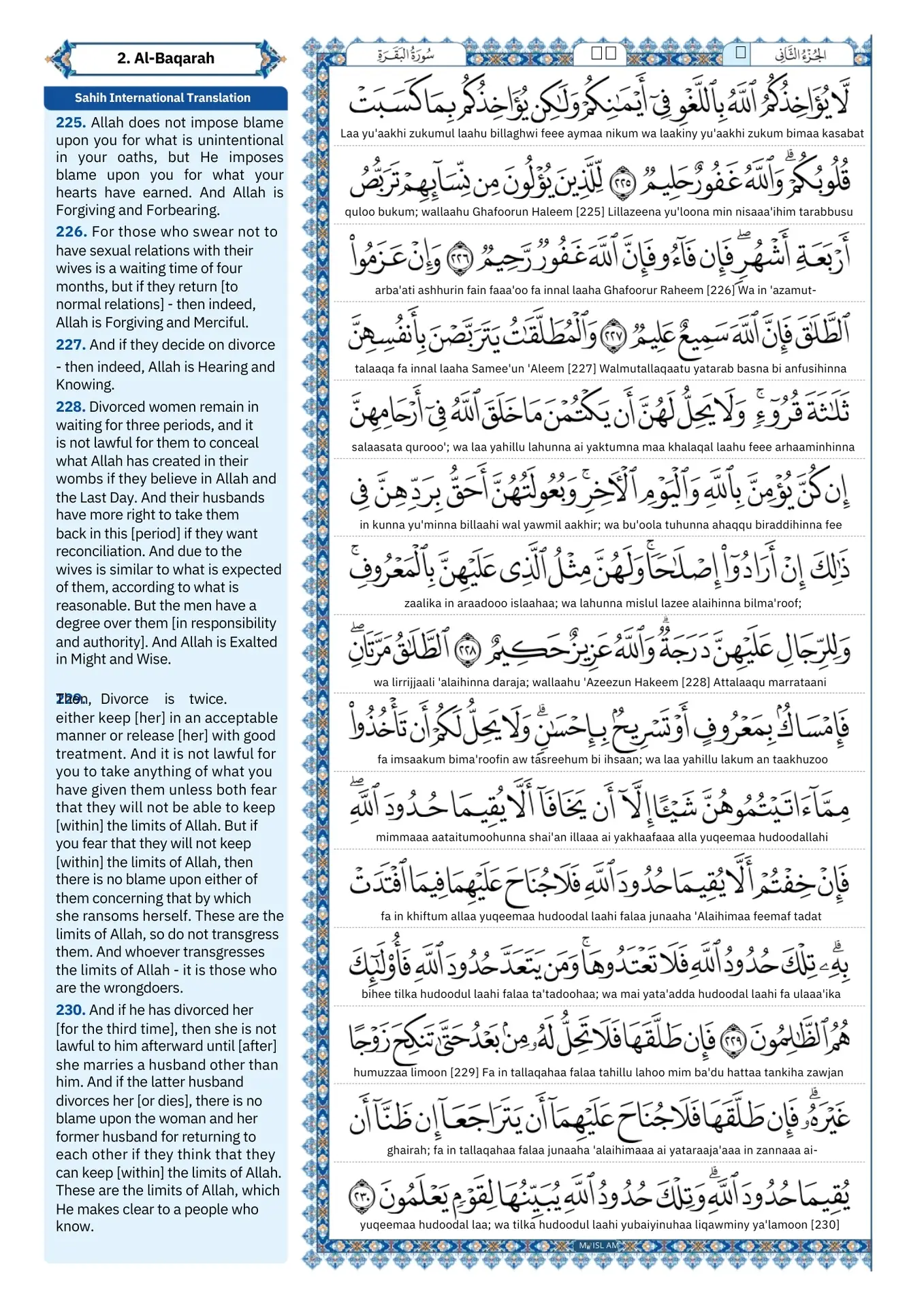 At-talaaqu marrataan; fa-imsaakum bima’roofin aw tasreehum bi-ihsaan; wa laa yahillu lakum an taakhuzoo mimmaaa aataitumoohunna shai’an illaaa ai yakhaafaaa allaa yuqeemaa hudoodal laah; fa-in khiftum allaa yuqeemaa hudoodal laahi falaa junaaha ‘alaihimaa feemaf tadaat bih; tilka hudoodul laahi falaa ta’tadoohaa; wa many-yata’adda hudoodal laahi faulaaa’ika humuz zaalimoona.230