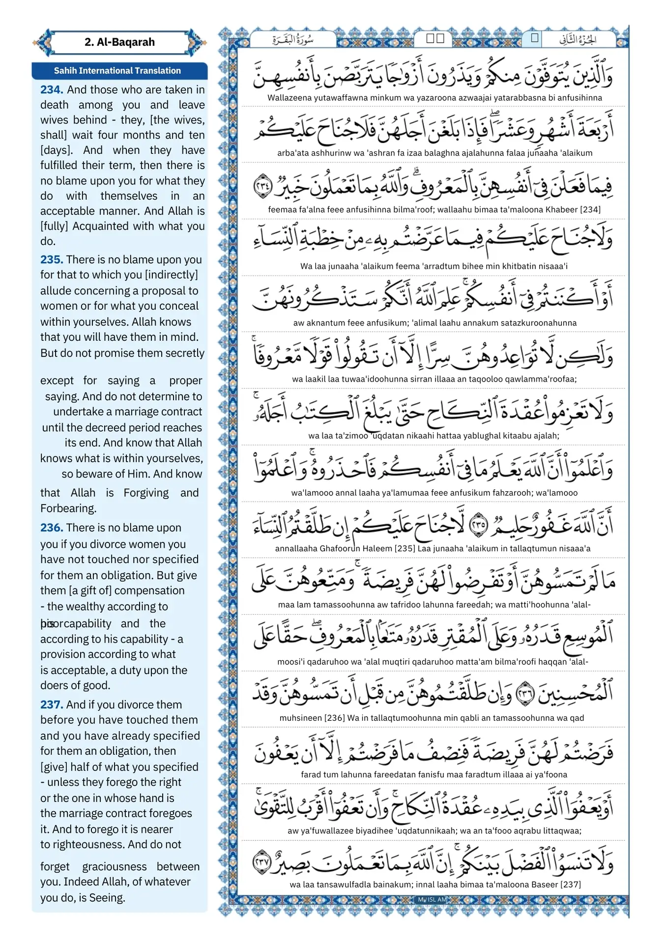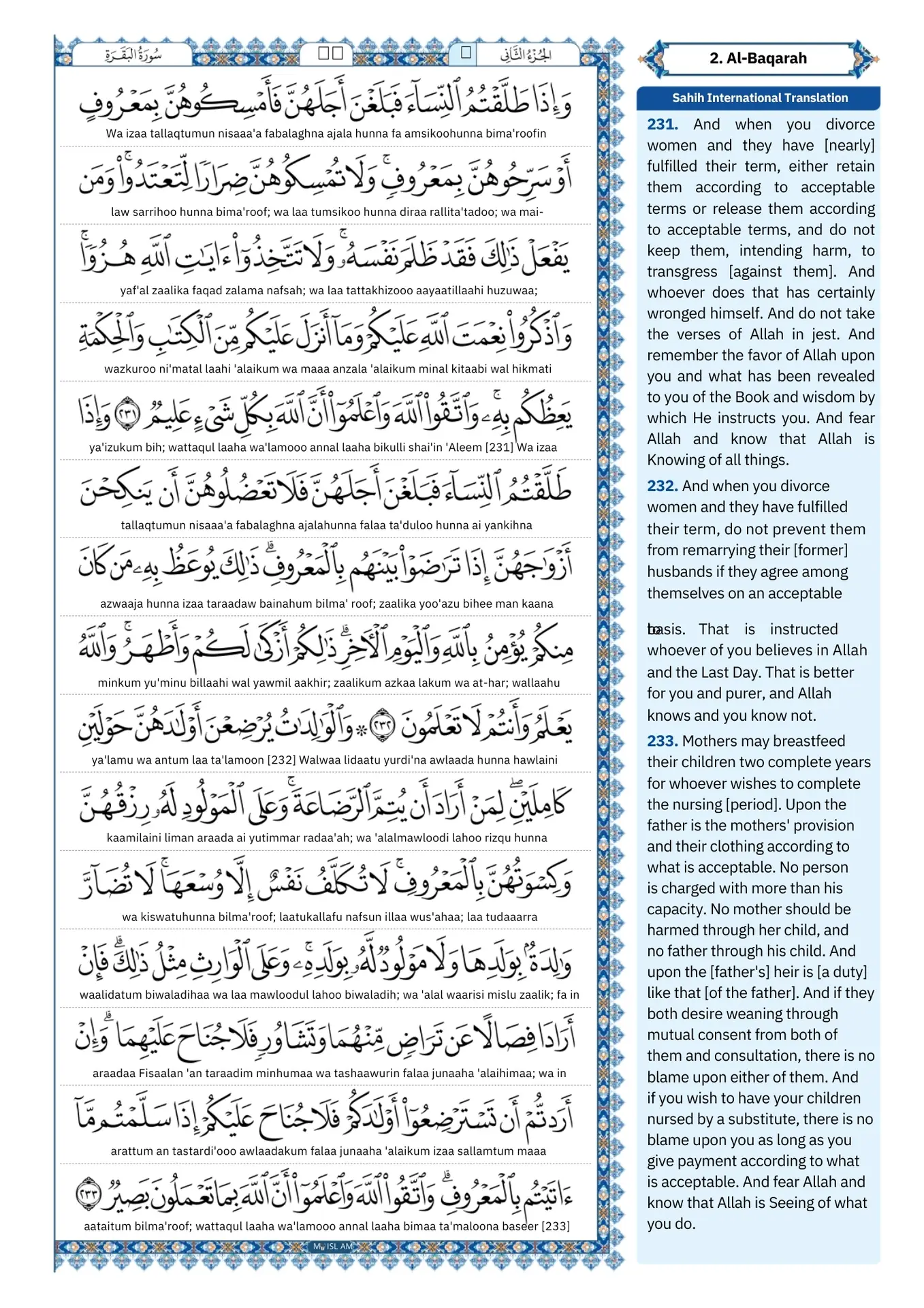Wal waalidaatu yurdi’na awlaadahunna hawlayni kaamilayni liman araada ai yutimmar radaa’ah; wa ‘alal mawloodi lahoo rizquhunna wa kiswatuhunna bilma’roof; laa tukallafu nafsun illaa wus’ahaa; laa tudaaarra waalidatun biwaladihaa wa laa mawloodun lahoo biwaladihee; wa ‘alal waarisi mislu zaalika; fa-in araadaa fisaalan ‘an taraadin minhumaa wa tashaawurin falaa junaaha ‘alaihimaa; wa in arattum an tastardi’ooo awlaadakum falaa junaaha ‘alaikum izaaa sallamtum maaa aataitum bilma’roof; wattaqul laaha wa’lamooo annal laaha bimaa ta’maloona Baseer.234