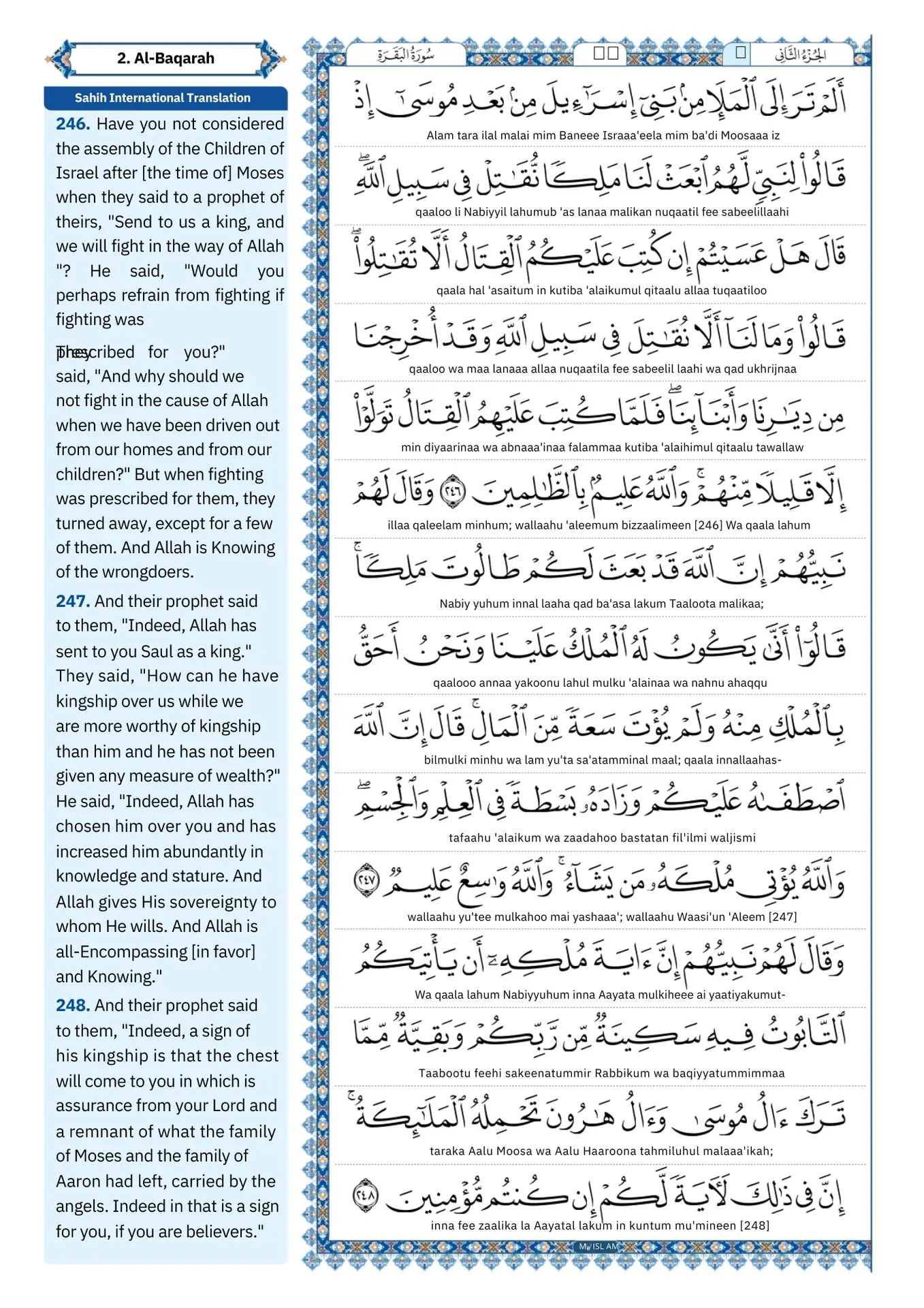 Alam tara ilal mala-i mim Baneee Israaa’eela mim ba’di Moosaa iz qaaloo li Nabiyyil lahumub ‘as lanaa malikan nuqaatil fee sabeelil laahi; qaala hal ‘asaitum in kutiba ‘alaikumul qitaalu al-laa tuqaatiloo; qaaloo wa maa lanaa allaa nuqaatila fee sabeelil laahi wa qad ukhrijnaa min diyaarinaa wa abnaaa’inaa; fa lammaa kutiba ‘alaihimul qitaalu tawallaw illaa qaleelam minhum; wal laahu ‘Aleemun bizzaalimeen.247