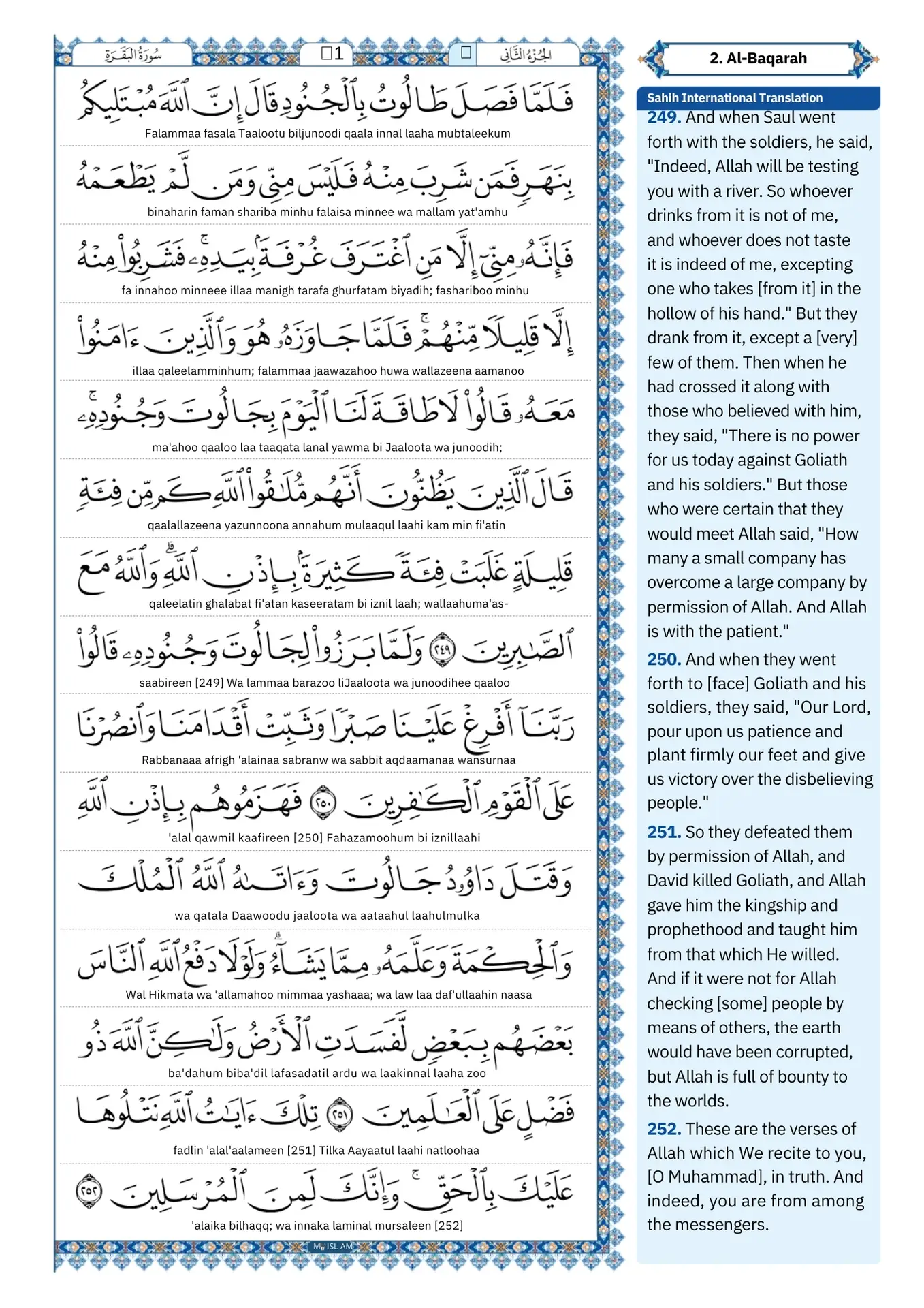 Fa lammaa fasala Taalootu biljunoodi qaala innal laaha mubtalikum binaharin faman shariba minhoo falaisa minnee wa mal lam yat’amhu fa innahoo minnee illaa mani ghatarafa ghurfatam biyadih; fa shariboo minhoo illaa qaleelam minhum; fa lammaa jaawazahoo huwa wallazeena aamanoo ma’ahoo qaaloo laa taaqata lanaa alyawma bijaaloota wa junoodih; qaalal lazeena yazunnoona annahum mulaaqoo allaahi kam min fi’atin qaleelatin ghalabat fi’atan kaseeratan bi-iznillaahi; wal laahu ma’as saabireen.250