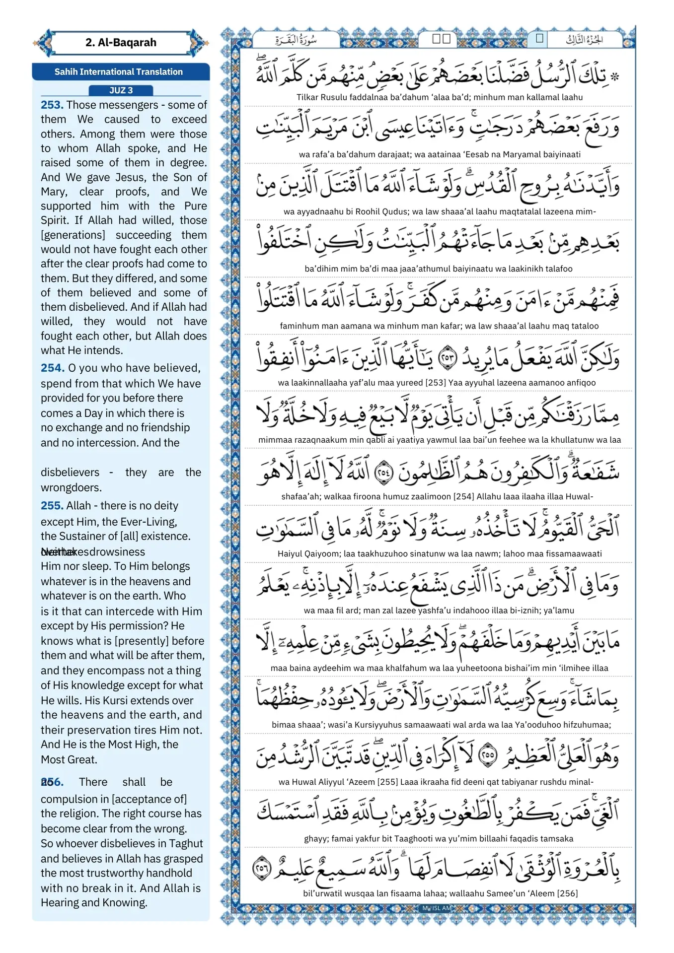 Allaahu laaa ilaaha illaa Huwal Haiyul Qaiyoom; laa ta’khuzuhuu sinatunw wa laa nawmun; lahoo maa fis samaawaati wa maa fil ard; man zallazee yashfa’u indahooo illaa bi-iznih; ya’lamu maa baina aideehim wa maa khalfahum; wa laa yuheetoona bishai’im min ‘ilmihee illaa bimaa shaaa’; wasi’a kursiyyuhus samaawaati wal-ard; wa laa ya’ooduhuu hifzuhumaa; wa Huwal ‘Aliyyul ‘Azeem.256