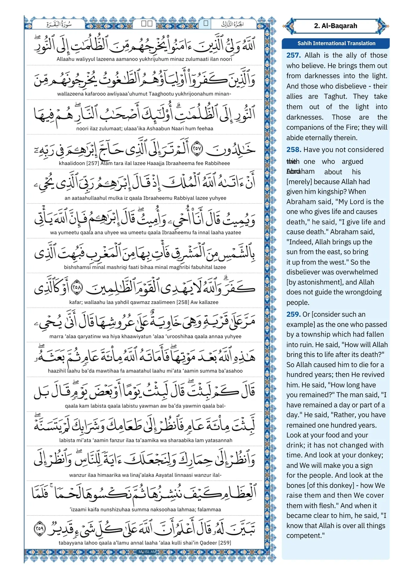 Aw kallazee marra ‘alaa qaryatinw wa hiya khaawiyatun ‘alaa ‘urooshihaa; qaala annaa yuhyee haazihil laahu ba’da mawtihaa; fa amaatahul laahu mi-ata ‘aamin summa ba’asah; qaala kam labist; qaala labistu yawman aw ba’da yawm; qaala bal labista mi-ata ‘aamin fanzur ilaa ta’aamika wa sharaabika lam yatasannah; wan zur ilaa himaarika wa linaj ‘alaka Aayatal linnaasi wan zur ilal ‘izaami kaifa nunshizuhaa summa naksoohaa lahmaa; fa lammaa tabaiyana lahoo qaala a’lamu annal laaha ‘alaa kulli shai’in Qadeer.260