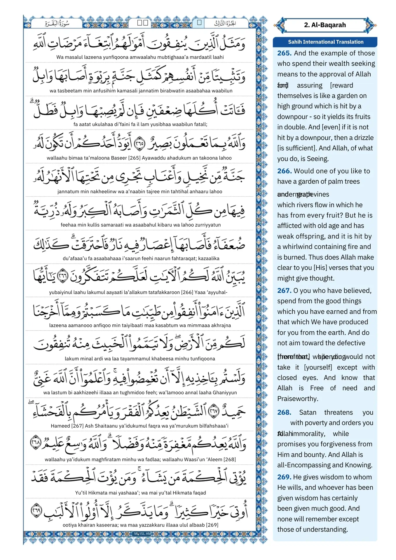 Yaaa ayyuhal lazeena aamanoo laa tubtiloo sadaqaatikum bil manni wal azaa kallazee yunfiqu maalahoo ri aaa’an naasi wa laa yu’minu billaahi wal yawmil aakhir; famasaluhoo kamasali safwaanin ‘alaihi turaabun fa asaabahoo waabilun fatarakahoo saldaa; laa yaqdiroona ‘alaa shai’im mimmaa kasaboo; wal laahu laa yahdil qawmal kaafireen.265