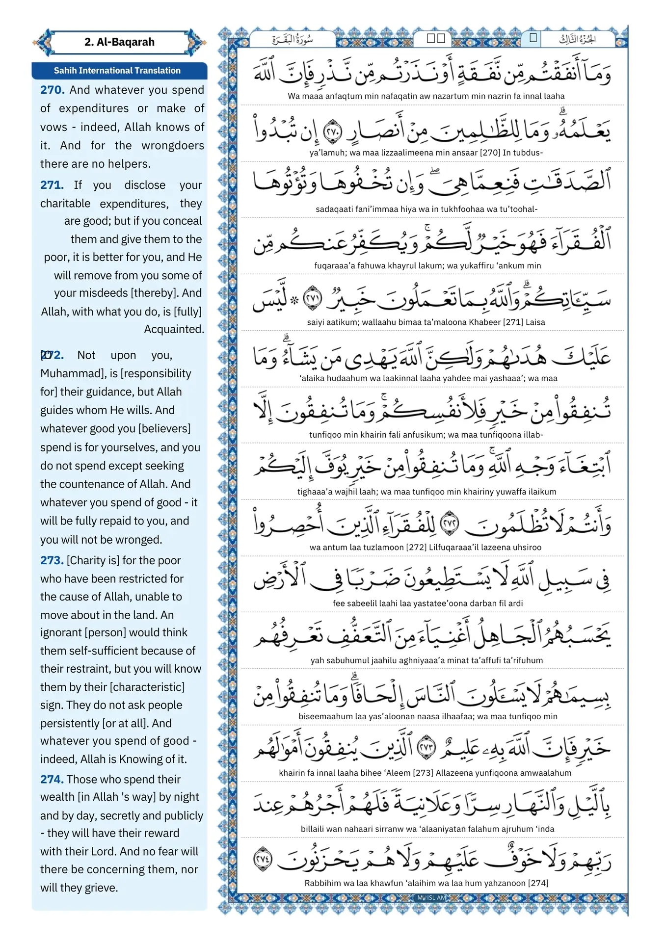 Laisa ‘alaika hudaahum wa laakinnal laaha yahdee mai yashaaa’; wa maa tunfiqoo min khairin fa li-anfusikum; wa maa tunfiqoona illabtighaaa’a wajhil laah; wa maa tunfiqoo min khairiny yuwaffa ilaikum wa antum laa tuzlamoon.273