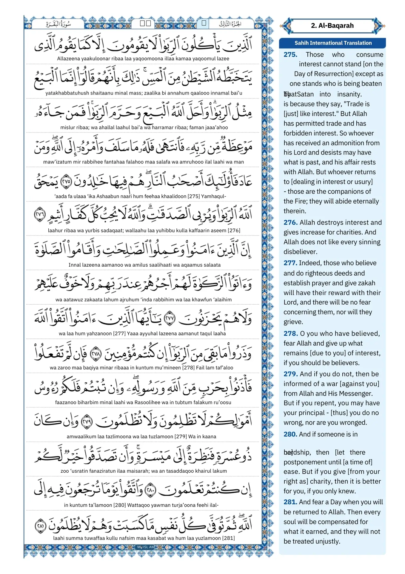 Allazeena yaakuloona ribaa laa yaqoomoona illaa kamaa yaqoomul lazee yatakhabbatuhush Shaitaanu minal mass; zaalika bi annahum qaalooo innamal bai’u mislur ribaa; wa ahallal laahul bai’a wa harramar ribaa; fa man jaaa’ahoo maw’izatun mir rabbihi fantahaa fa lahoo maa salafa wa amruhooo ilal laah; wa man ‘aada fa ulaaa’ika Ashaabun Naari hum feehaa khaalidoon.276