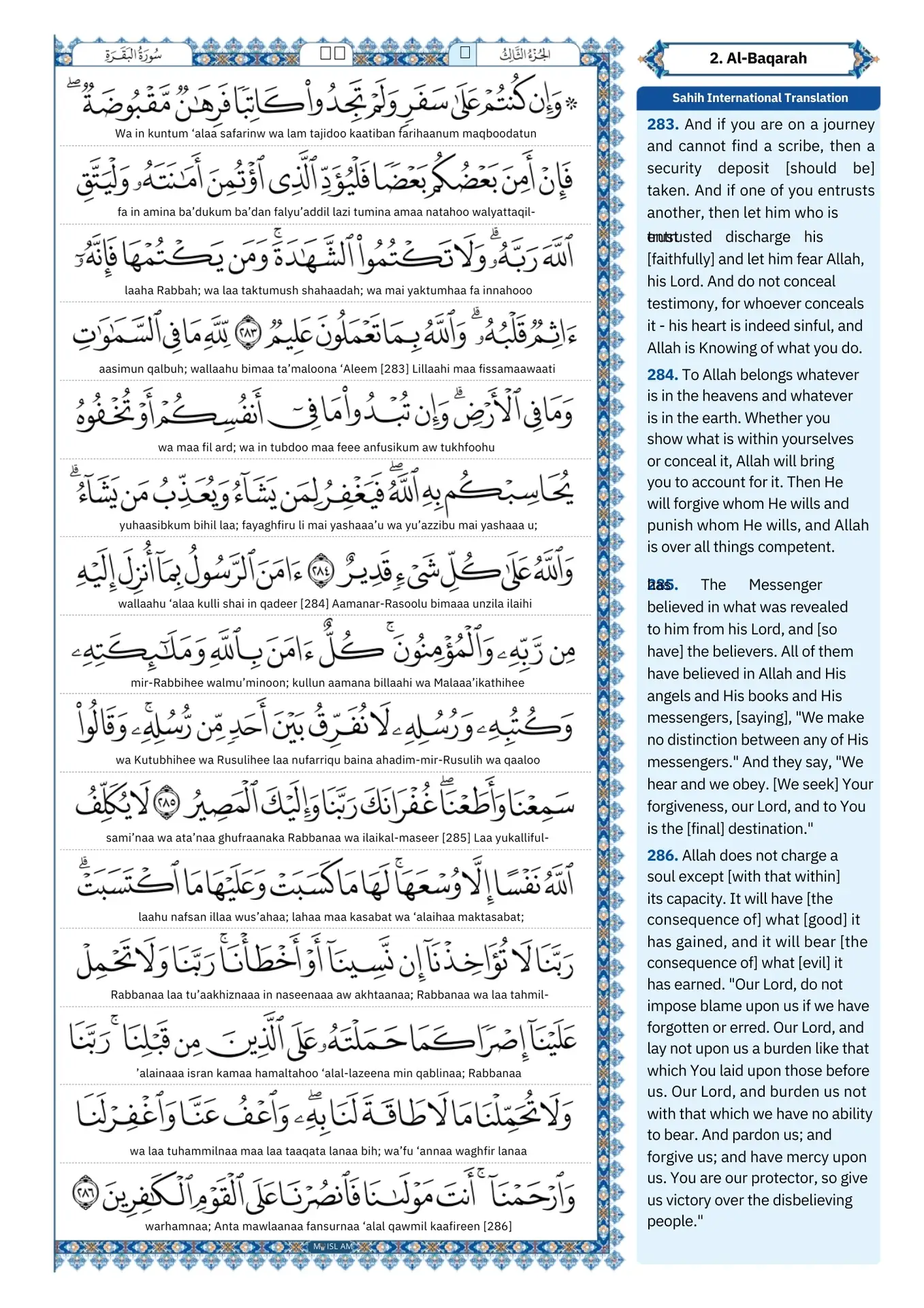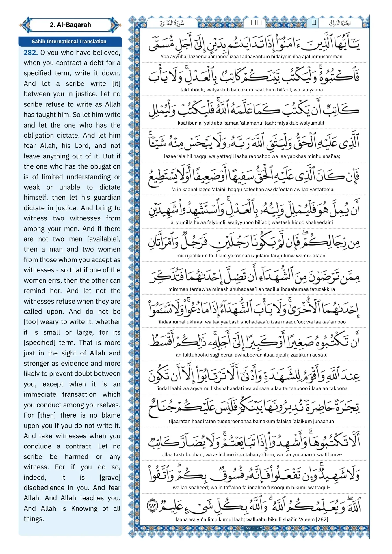 Yaaa ayyuhal lazeena aamanoo izaa tadaayantum bidaynin ilaa ajalim musamman faktubooh; walyaktub bainakum kaatibum bil ‘adl; wa laa yaabaa kaatibun ai yaktuba kamaa ‘allamahul laah; falyaktub walyumlilillazee ‘alaihil haqqu walyattaqil laaha rabbahoo wa laa yabkhas minhu shai’aa; fa in kaanallazee ‘alaihil haqqu safeehan aw da’eefan aw laa yastatee’u ai yumilla huwa falyumlil waliyyuhoo bil ‘adl; wastashhidoo shaheedaini mir rijaalikum fa il lam yakoonaa rajulaini farajulunw wamra-ataani mimman tardawna minash shuhadaaa’i an tadilla ihdaahumaa fatu zakkira ihdaahumal ukhraa; wa laa yaabaa ash shuhadaaa’u izaa maa du’oo; wa laa tas-amooo an taktuboohu sagheeran aw kabeeran ilaaaa ajalihee; zaalikum aqsatu ‘indal laahi wa aqwamu lish shahaadati wa adnaa alaa tartaabooo illaaa an takoona tijaaratan haadiratan tudeeroonahaa bainakum falaa junaaha ‘alaikum al-laa taktuboohaa; wa ashhidoo izaa tabaaya’tum; wa laa yudaarra kaatibunw wa laa shaheed; wa in taf’aloo fa innahoo fusooqum bikum; wattaqul laaha wa yu’allimukumullaah; wal laahu bikulli shai’in ‘Aleem.283